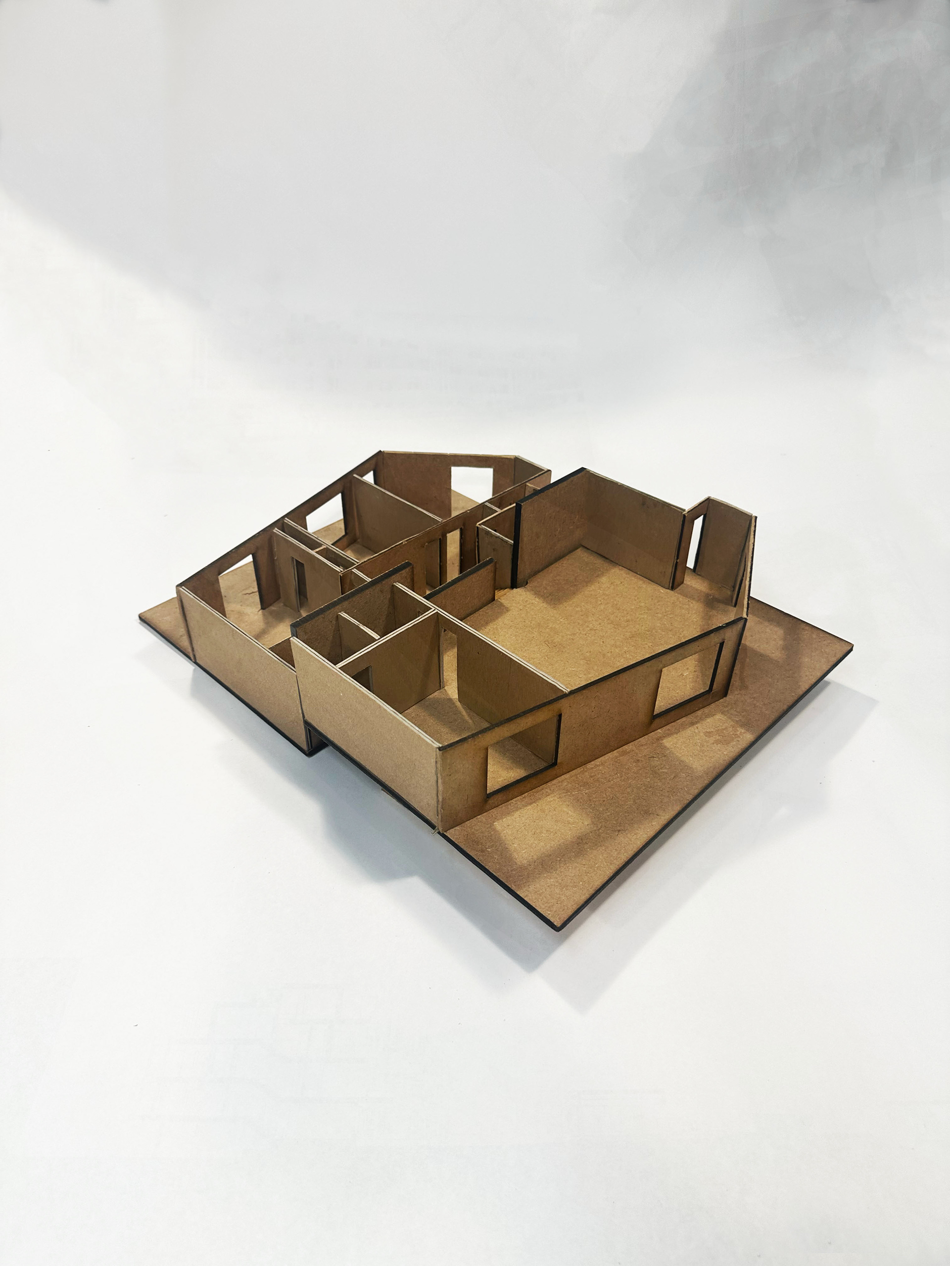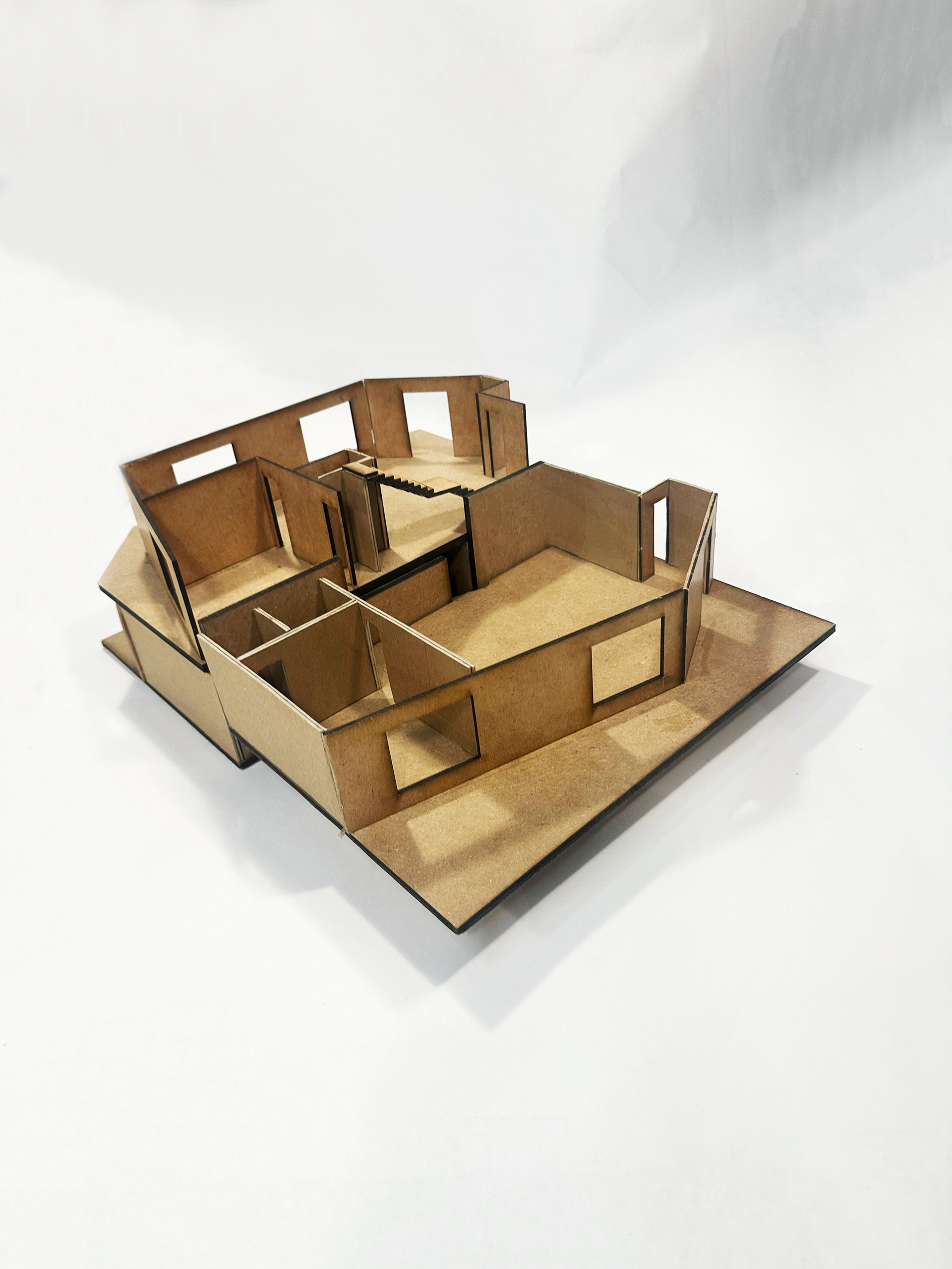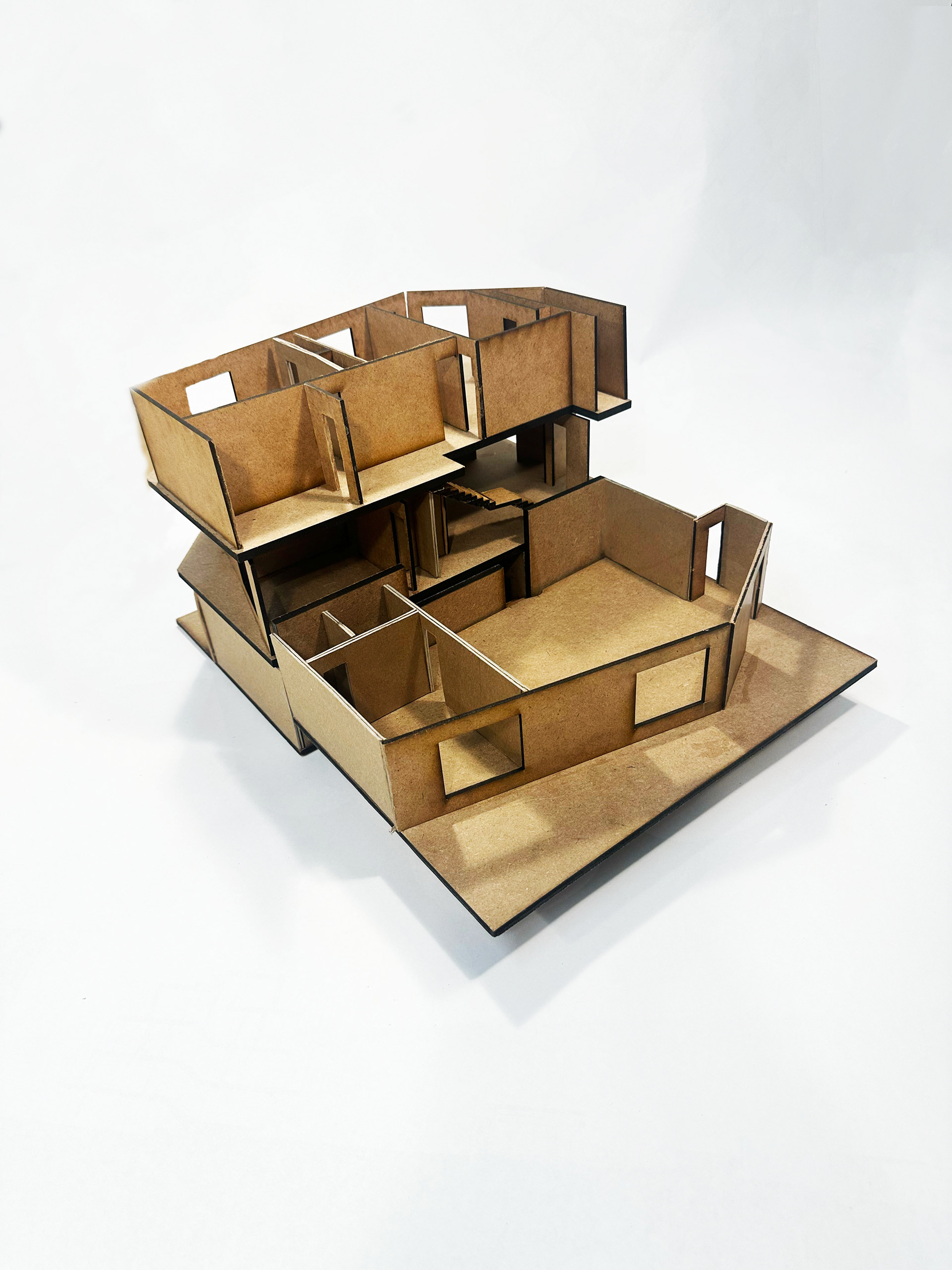 The back half of the site has a 12’ level change which I took advantage of with a split level building. This allowed my staircases to act as the only necessary circulation in the building.